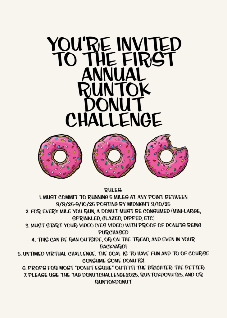 You’ve been challenged! Myself and all of the “Gutter Gang” have decided it’s time for the first official unofficial #runtok 5 mile donut challenge🙌🏼 we will be hosting a TT live to answer any other questions anyone may have tonight at 7:30pm central time! Rules at the end of the video🩷 please share and tag your fellow runners! Thank you to @RunningwtheHord @Sargent | Running & Band 🎶 @Ashley✌💖 @Robyn | Runner | Mama @running_chad @runningdude22 @FSURunner3 @JeffreyGruns @Chappell-Adventure @heatherrunstexas @Rj Croat135 @Zac | Ohio Runner @Donna @Cole Cannon for being such amazing friends and role models for fun in the community! Love you all 😘 #run#runtokcommunity#running#challenge#runtokdonutchallenge2025#runtokdonut25#2025donutrun#marathontraining#runners#runnerthings