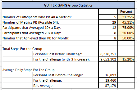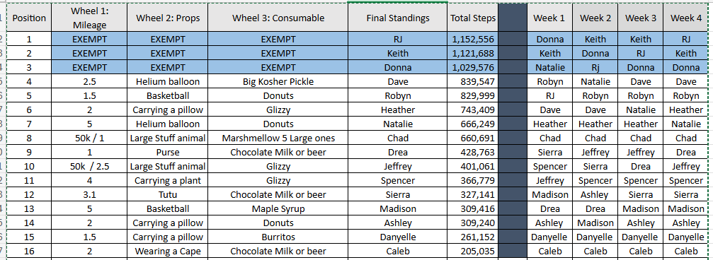 📊 THE DRAMA SNAPSHOT (WEEKLY LEADERS) 📸 WEEKLY STANDINGS SNAPSHOT (THE DRAMA ARC) Week 1: Donna | Keith | Natalie — innocent times Week 2: Keith | Donna | RJ — power struggle begins Week 3: Keith | RJ | Donna — knife sharpening noises Week 4:RJ | Keith | Donna — hostile takeover complete 🏆 THE PODIUM (ABOVE CONSEQUENCES) 🥇 RJ — 1,152,556 steps Didn’t panic. Didn’t overshare. Stayed lurking in the background until Week 4, then detonated the leaderboard. Exempt. Untouched. Menace behavior.